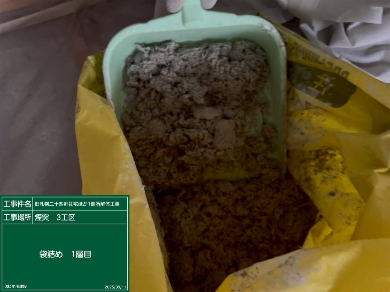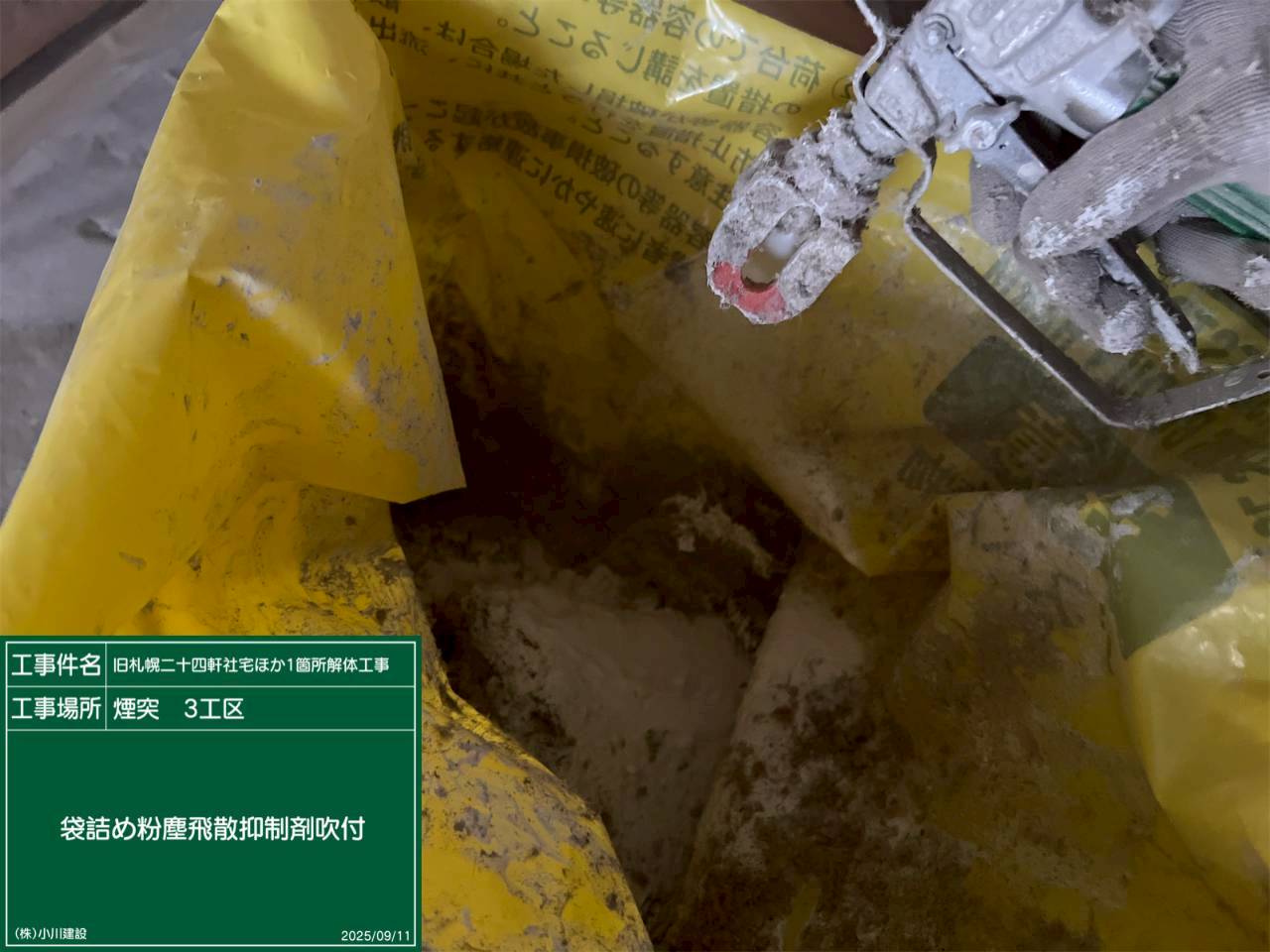 黒板の名前:袋詰め_粉じん飛散抑制剤吹付